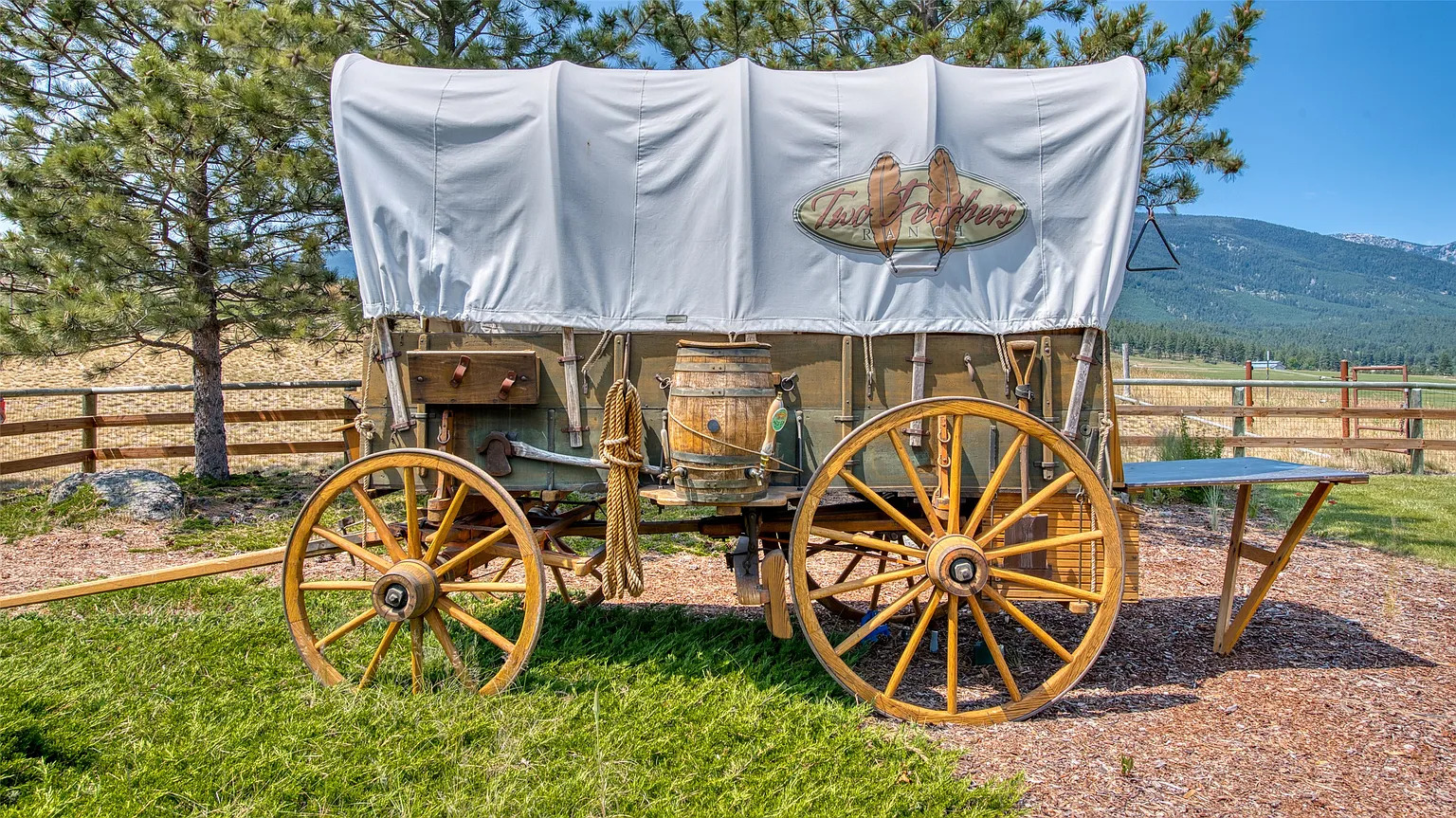 A separate 1,440-square-foot guest house offers two bedrooms, two baths, and a well-equipped kitchen and living area for visitors. The guests have their own laundry and a separate driveway as well. The barn below offers three horse stalls, a central alley for housing the amazing replica chuck wagon with cooking amenities used for family and ranch events.